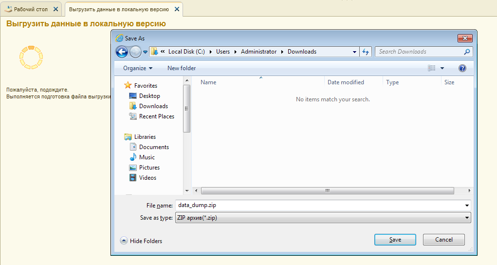 3. Перейдіть у розділ «Адміністрування» та виберіть команду «Вивантажити дані в локальну версію».